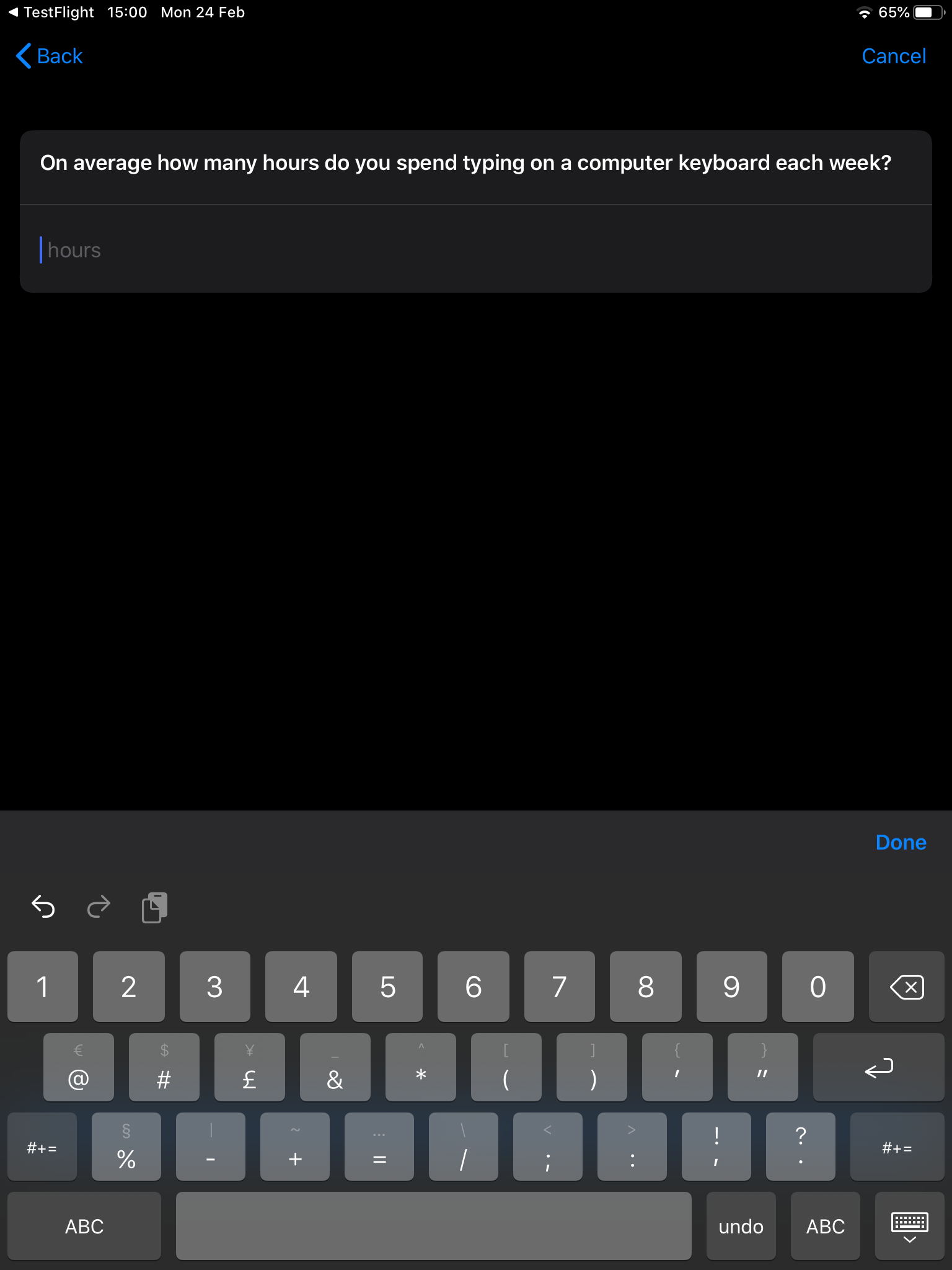 When you open the app and enter the PIN code you were given you will be provided with information about the specific research project you have been invited to, and given the opportunity to participate. If you choose to participate you will be taken to a brief questionnaire that asks you about yourself, how often you type and whether you have any conditions that might be relevant to the study.