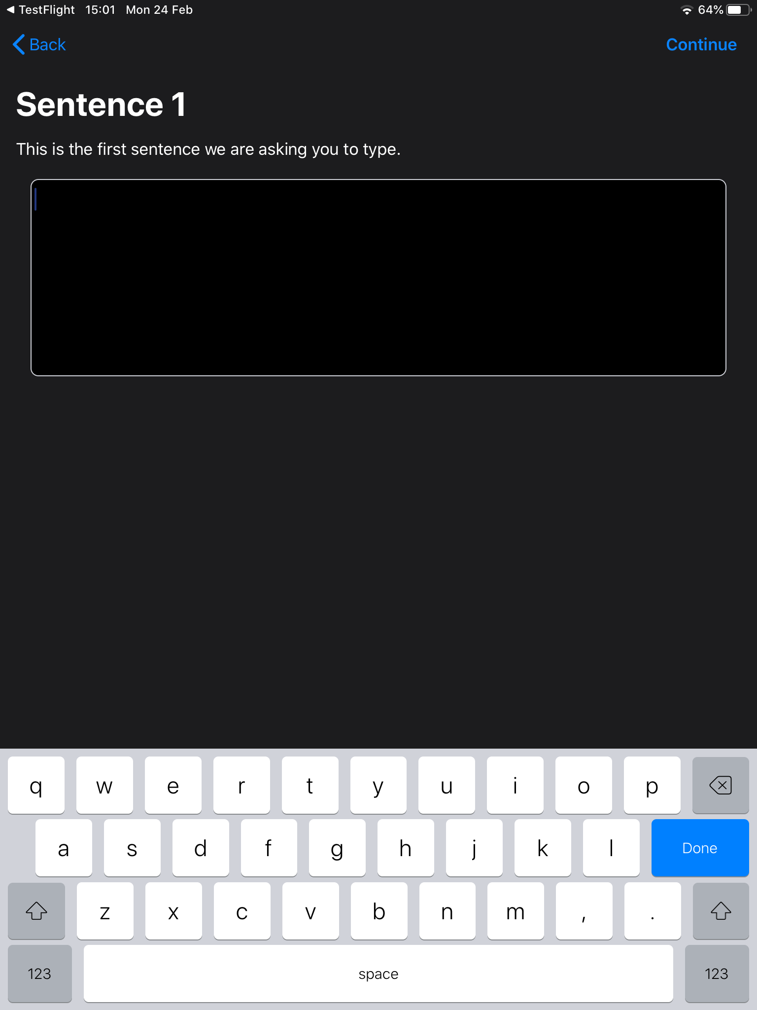 Typing research iOS is an iPhone and iPad app that allows us to study a participant's typing and related motor abilities via their own device. Our goal is to be able to detect markers of different conditions, such as Parkinson's Disease and Dementia, in typing, and thereby to contribute early diagnosis and monitoring. In order to do so we need to study the typing of a wide range of people, both people with such conditions, and people without.